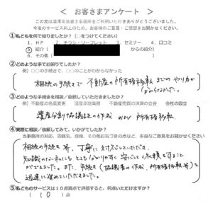 投稿日2022年8月3日 私どもを何で知りましたか? 不動産会社からのご紹介 どのような事でお困りでしたか? 相続手続きで不動産所有権移転までのやり方が分からなかった どのような手続きを相談/依頼していただきましたか? 遺産分割協議書の作成および所有権移転登記 実際に相談/依頼してみて、いかがでしたか? 相続手続き等、丁寧に対応していただき、知識のない私にもとても分かりやすく、安心して依頼することができました。 また、手続き(協議書の作成、所有権移転等)を迅速に進めて頂きました。